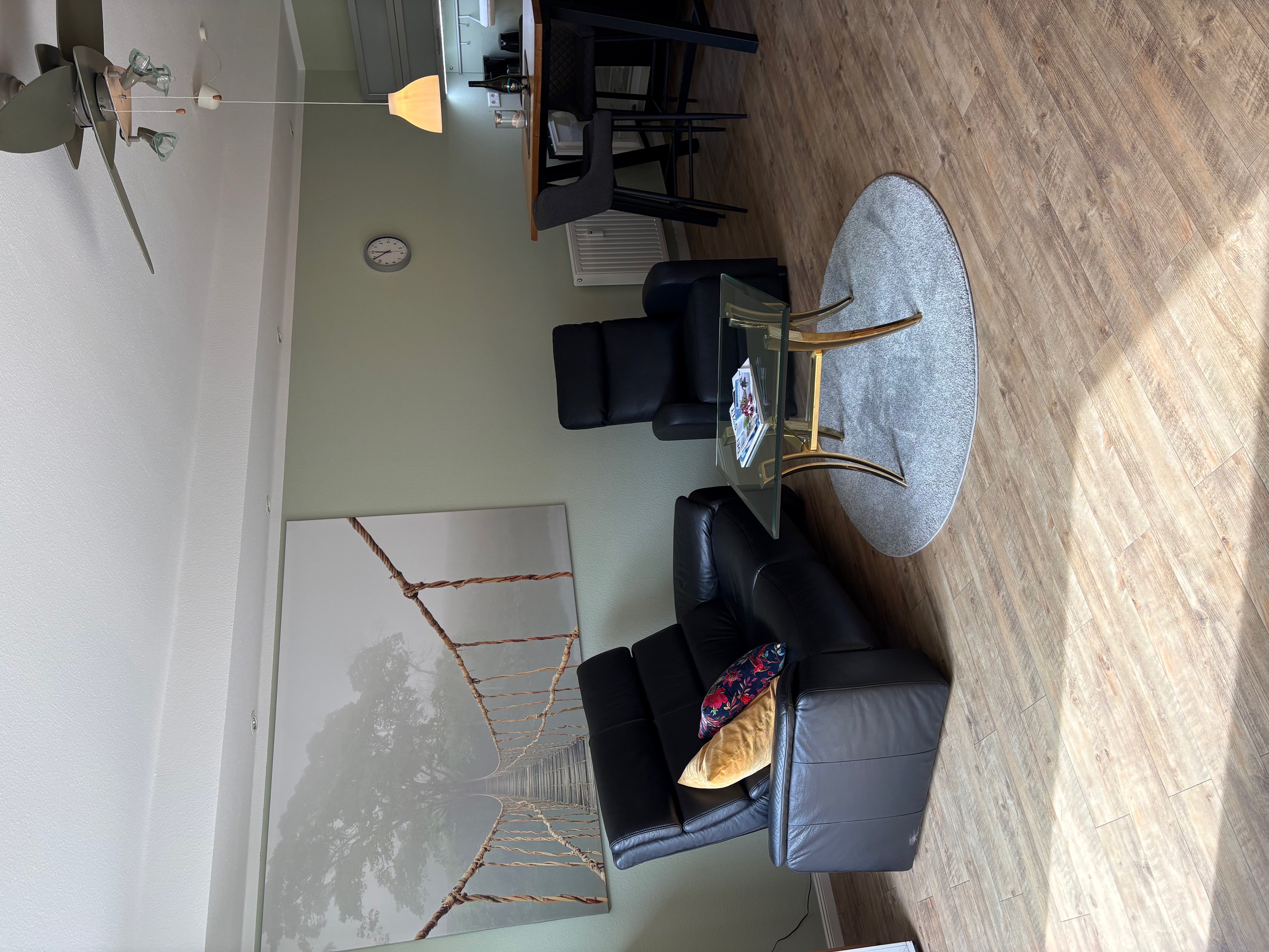 - ein großer Wohnraum mit Küchenzeile, "Eß-"tresen, gemütlicher Sitzecke und Garderobe