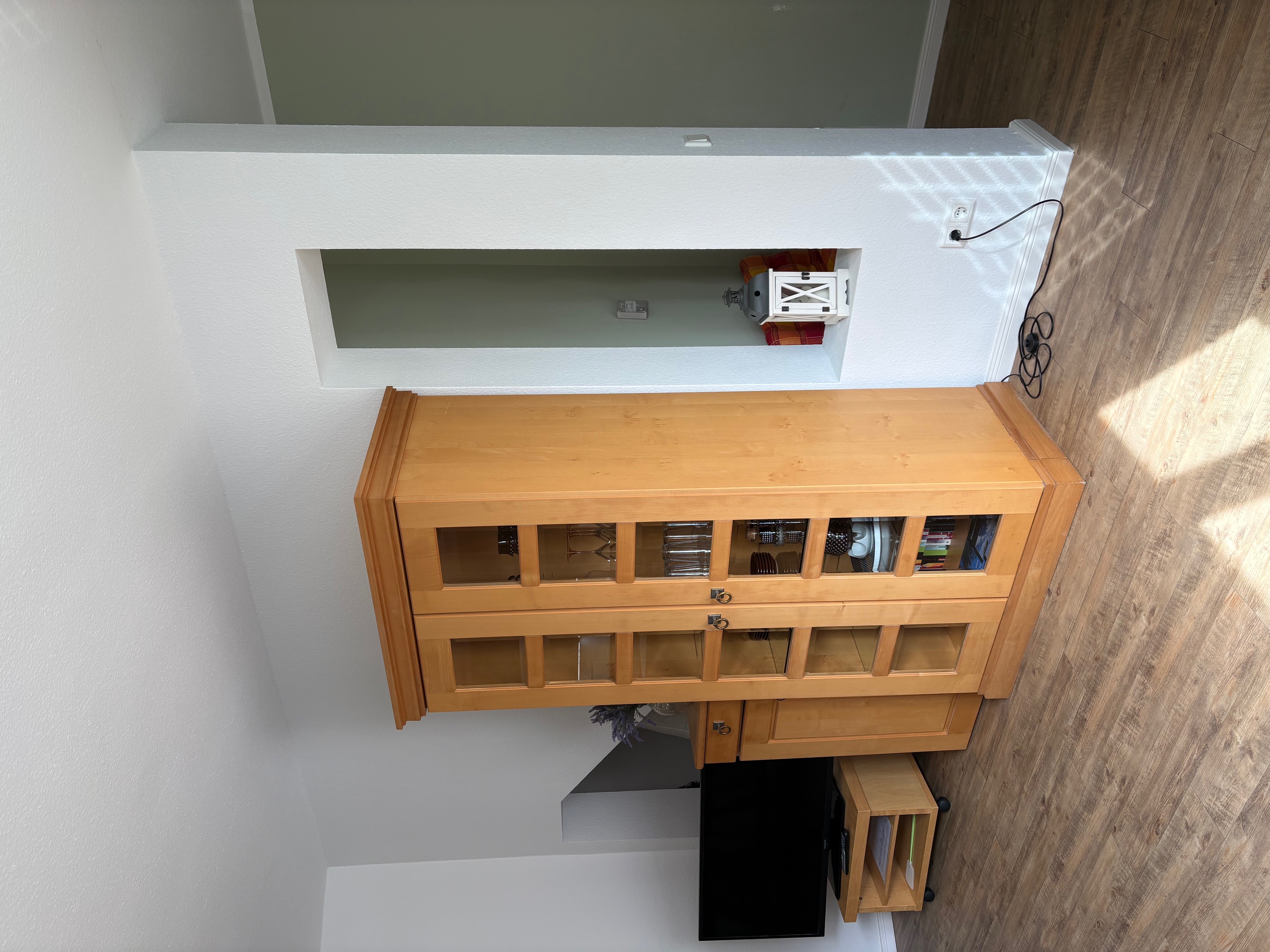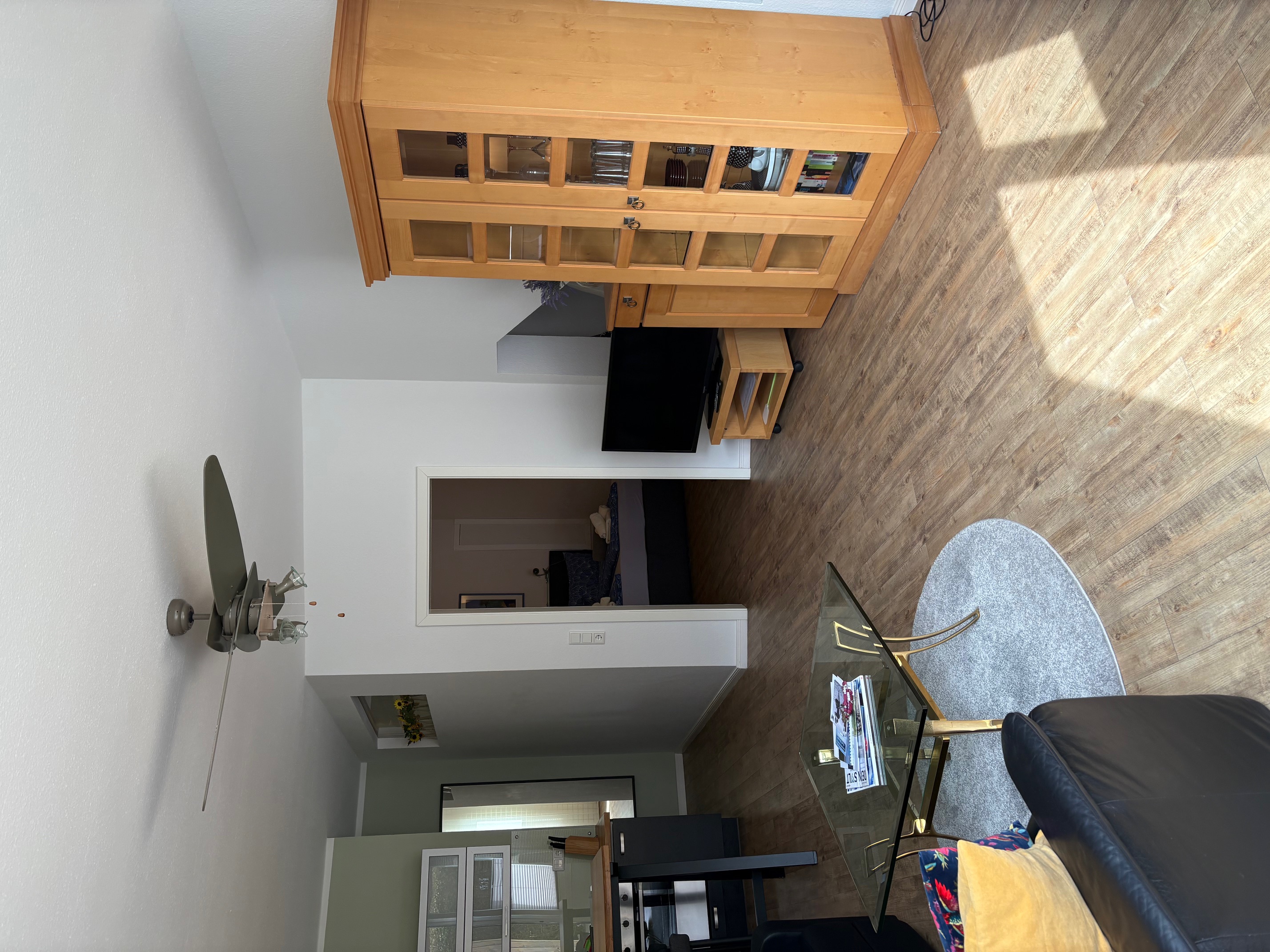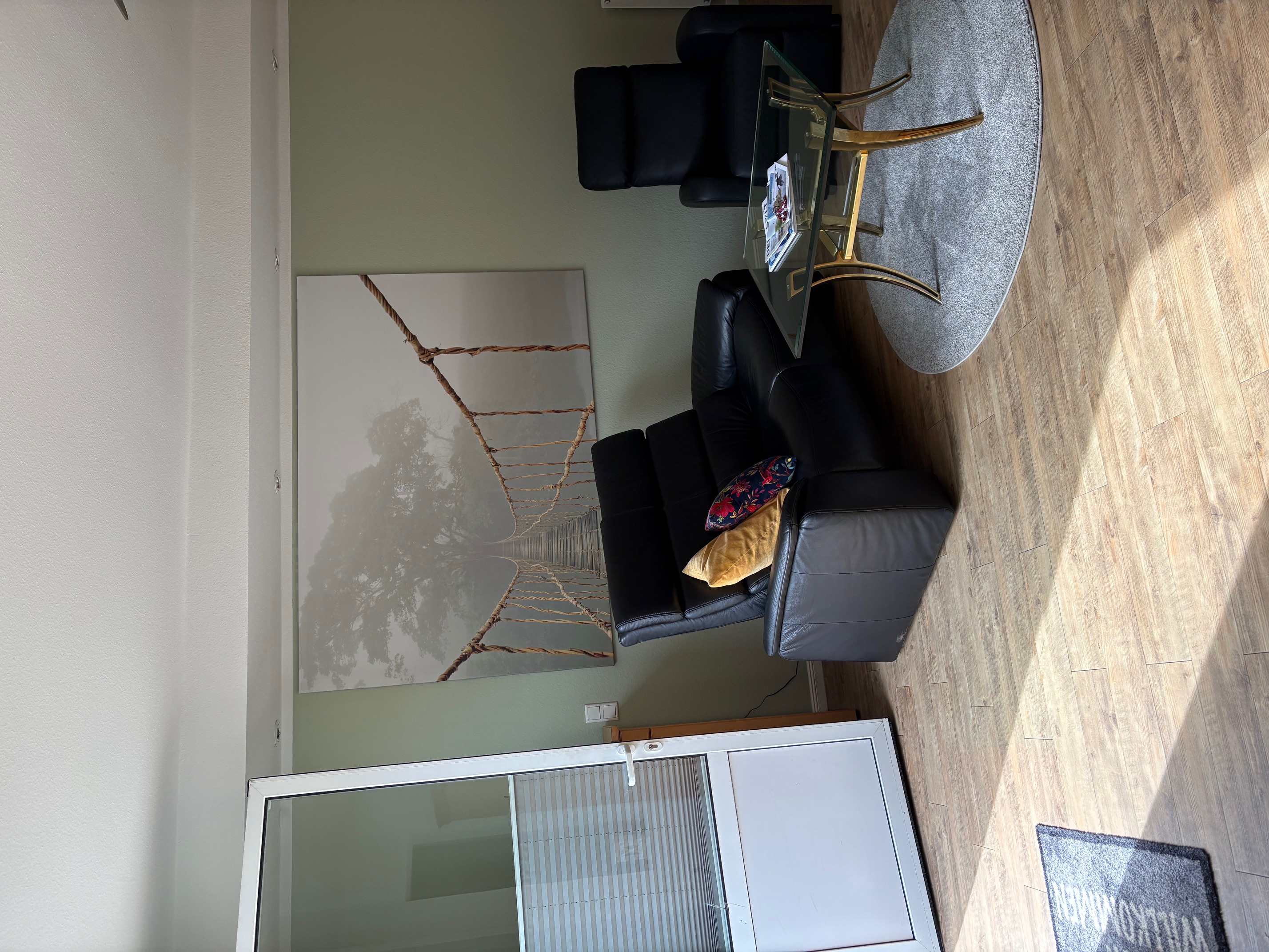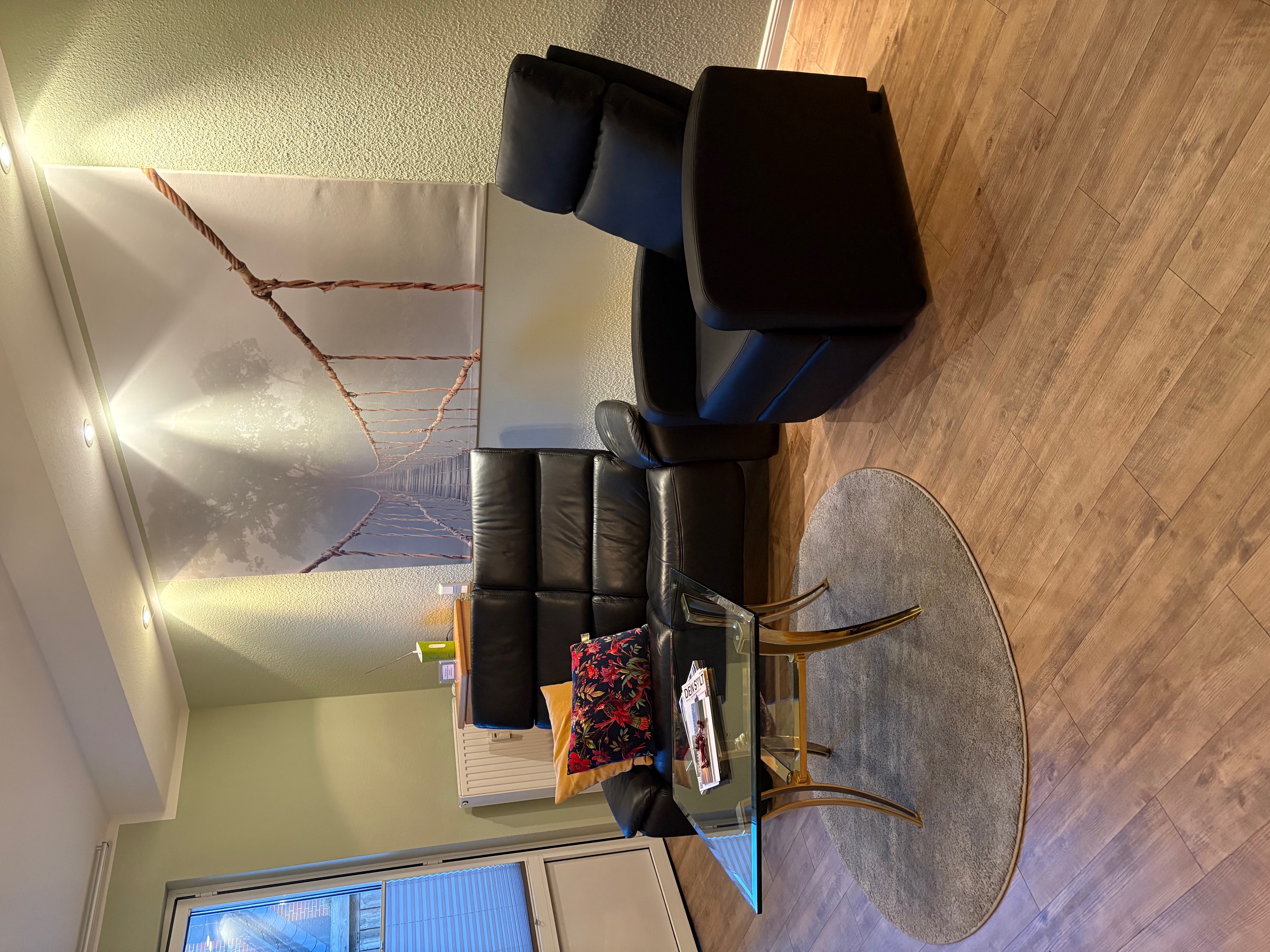 - ein großer Wohnraum mit Küchenzeile, "Eß-"tresen, gemütlicher Sitzecke und Garderobe